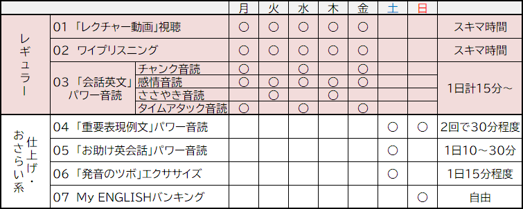 A. 推奨しているのは、平日40分程度。週末に1時間程度です。その内訳は、3人の先生たちの「レクチャー動画」視聴(10分程度)/メイン会話文の「ワイプリスニング」(5分以上)/メイン会話文の「パワー音読」2(20分以上)です。